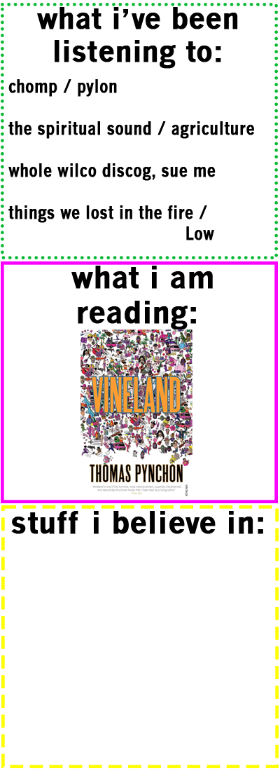 Extra soft toothbrush, aluminum foil, genmaicha tea, ceramics class, Missy Elliott, wearing socks twice (at least), first COB LP, long johns, doing what you want but shutting up about it, DIY recording, Sunday dinners at the local community center, Mayor Mamdani.